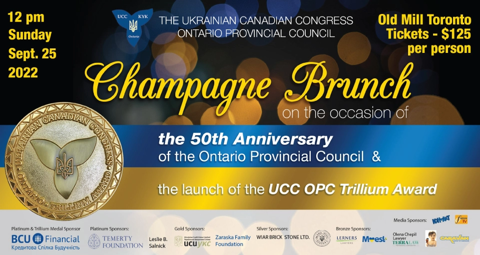 50-летие Конгресса украинцев Канады – 2022 Ontario Provincial Council состоится 25 сентября 2022 года в 12:00 в Old Mill Торонто. Все лауреаты приглашены на бранч с шампанским для торжественного получения своих наград.